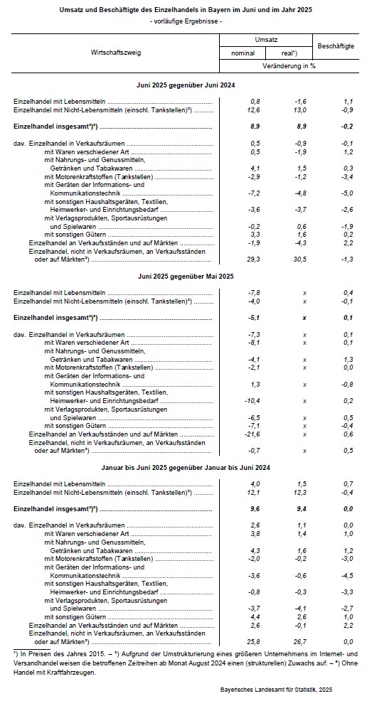 Wie das Bayerische Landesamt für Statistik nach den ersten vorläufigen Ergebnissen der „Monatsstatistik im Einzelhandel“ mitteilt, steigt der nominale Umsatz im bayerischen Einzelhandel (ohne Kraftfahrzeughandel) im ersten Halbjahr 2025 im Vergleich zum Vorjahreszeitraum um 9,6 Prozent und der reale Umsatz um 9,4 Prozent. Die Zahl der Beschäftigten bleibt konstant. Aufgrund der Umstrukturierung eines größeren Unternehmens im Internet- und Versandhandel weisen die betroffenen Zeitreihen ab Monat August 2024 einen (strukturellen) Zuwachs auf. Der nominale Umsatz des stationären Einzelhandels („Einzelhandels in Verkaufsräumen“) in Bayern nimmt in den ersten sechs Monaten 2025 um 2,6 Prozent zu und der reale Umsatz um 1,1 Prozent.