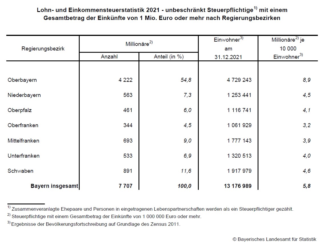 10 000 Einwohner, im Jahr 2020 waren es 5,2. Die höchste Millionärsdichte gab es im Landkreis Starnberg mit 26,4 Einkommensmillionären je 10 000 Einwohner. Es folgten der Landkreis München mit 16,4, der Landkreis Miesbach mit 16,0, die Stadt München mit 12,5 und die kreisfreie Stadt Landshut mit 8,7 Einkommensmillionären je 10 000 Einwohner.