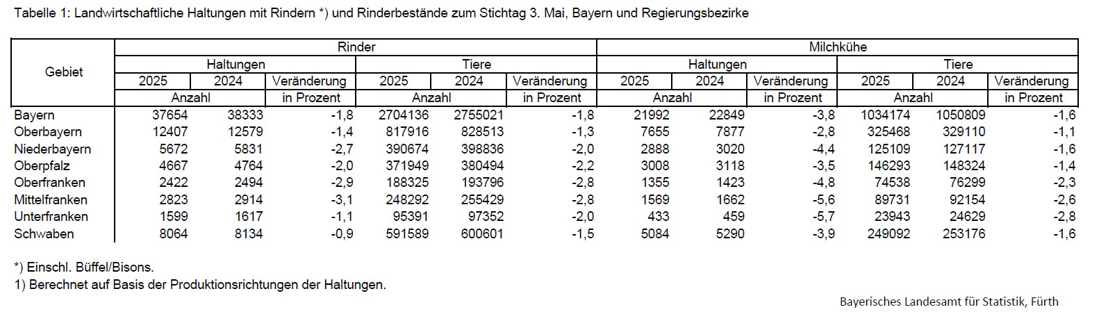 Fürth. Zum Stichtag 3. Mai 2025 weist das Fachteam des Bayerischen Landesamts für Statistik durch eine Auswertung des Verwaltungsverfahrens „Herkunftssicherungs- und Informationssystem Tier (HIT)“ 2 704 136 Rinder in 37 654 Haltungen in Bayern nach. Ergänzend zur bayernweiten Auswertung veröffentlichen die Statistiker regionale Zahlen.