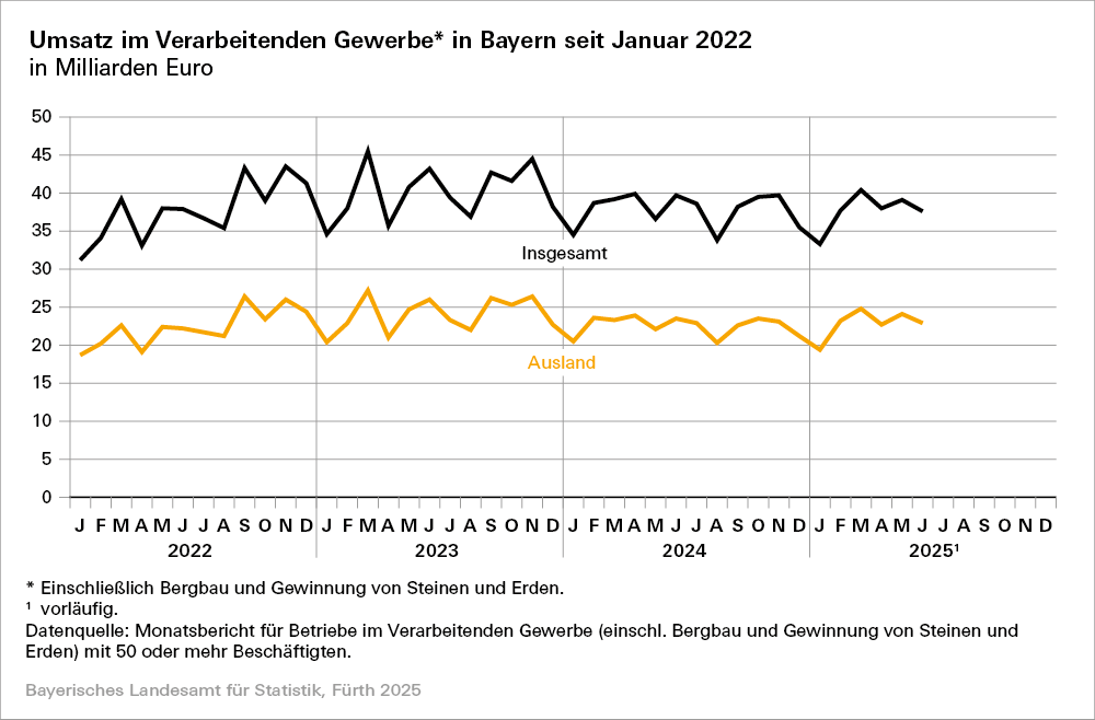 Das Verarbeitende Gewerbe Bayerns verzeichnet im ersten Halbjahr 2025 gegenüber dem Vorjahreshalbjahr ein Umsatzminus von 1,1 Prozent auf rund 226,1 Milliarden Euro. Nach Feststellung des Bayerischen Landesamts für Statistik erhöhen sich die Auslandsumsätze im selben Zeitraum um 0,1 Prozent auf 137,0 Milliarden Euro. Die Exportquote beträgt 60,6 Prozent. Die Umsätze mit den Ländern der Eurozone gehen um 4,0 Prozent zurück, ihr Anteil am Gesamtumsatz beläuft sich auf 19,4 Prozent. Die Nachfrage nach bayerischen Industriegütern erhöht sich preisbereinigt um 3,0 Prozent, der Personalstand verringert sich Ende Juni 2025 um 2,2 Prozent gegenüber dem Vorjahresmonat.