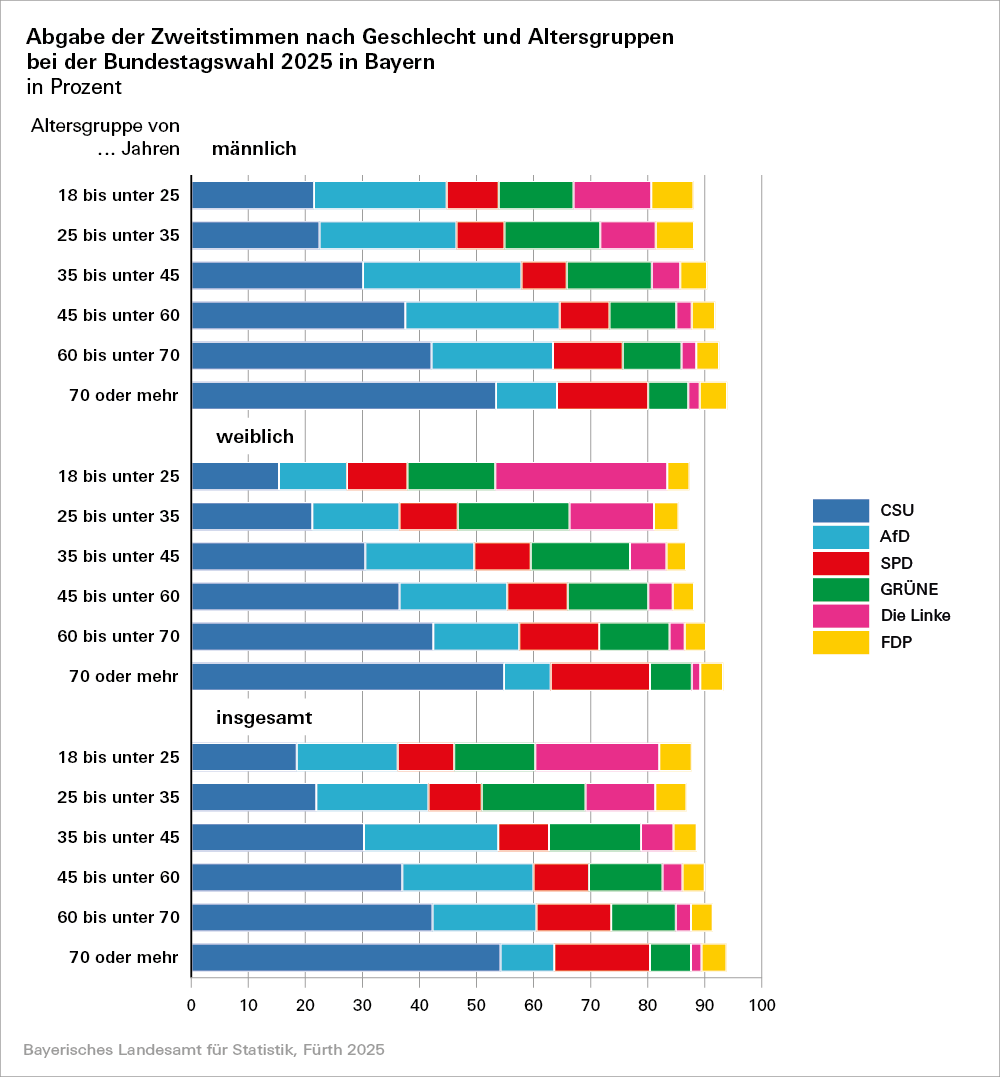 Mehr Ergebnisse – auch im Vergleich zur Bundestagswahl 2021 sowie gesonderte Zeitreihen – enthält der Statistische Bericht „Wahl zum 21. Deutschen Bundestag in Bayern am 23. Februar 2025. Repräsentative Wahlstatistik"(Bestellnummer: B7150C 202551);