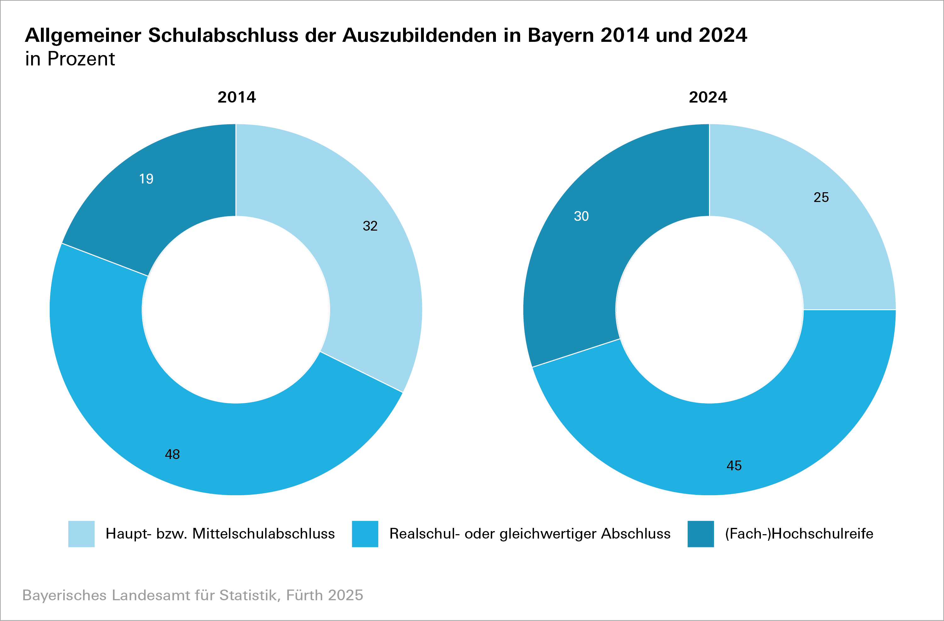 Damit geht auch ein Anstieg des allgemeinen Bildungsniveaus der Auszubildenden einher. Vor 10 Jahren verfügte knapp ein Drittel der Auszubildenden mit allgemeinem Schulabschluss über einen Haupt- oder Mittelschulabschluss (32 Prozent), 48 Prozent hatten die Schule mit der mittleren Reife abgeschlossen und 19 Prozent hatten die (Fach-)Hochschulreife erworben. 2024 zeigt sich hier ein anderes Bild: 25 Prozent der bayerischen Auszubildenden mit allgemeinem Schulabschluss geben einen Haupt- bzw. Mittelschulabschluss als höchsten Abschluss an, 45 Prozent haben die Realschule abgeschlossen und 30 Prozent haben (Fach-)Abitur.