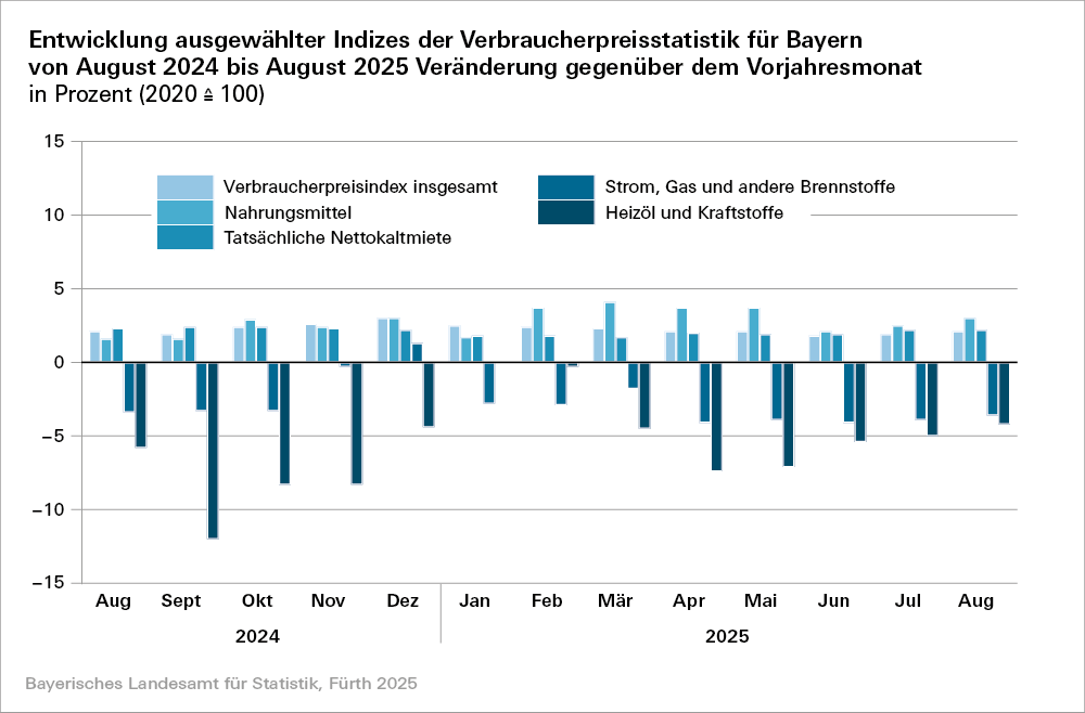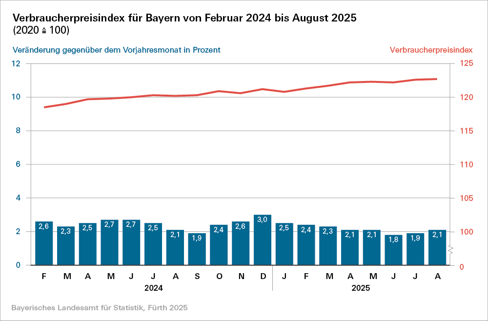 Verbraucherpreisindex für Bayern. Monatliche Indexwerte von Januar 2020 bis August 2025 mit Gliederung nach Haupt- und Sondergruppen“ (Bestellnummer: M1301C 202508).