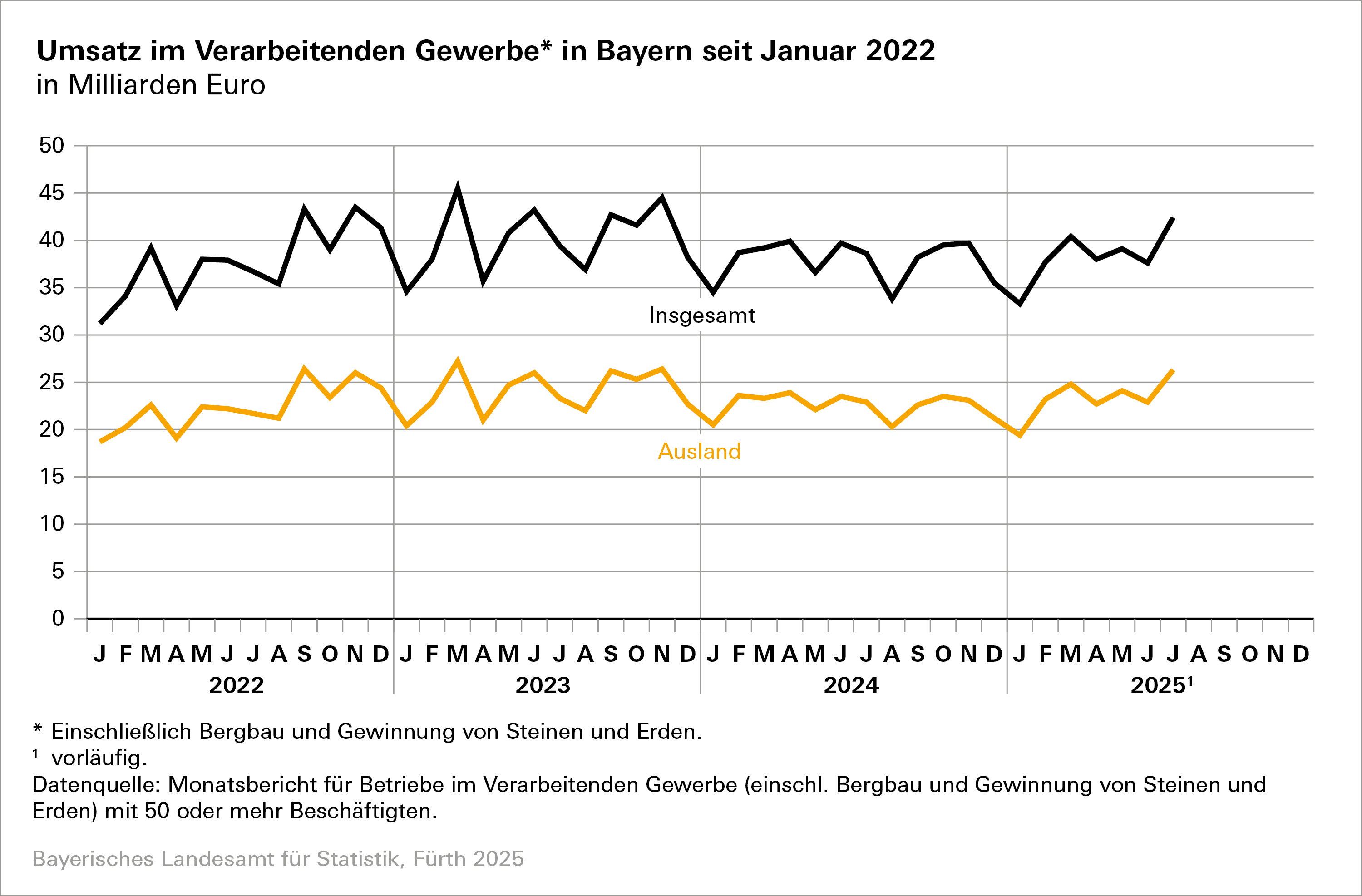 Fürth. Im Juli 2025 verzeichnet das Verarbeitende Gewerbe Bayerns ein Umsatzplus von nominal 9,7 Prozent gegenüber dem entsprechenden Vorjahreszeitraum. Der vergleichsweise hohe Anstieg ist insbesondere auf im Berichtsmonat abgeschlossene Großaufträge mehrerer Betriebe zurückzuführen. Das Verarbeitende Gewerbe, bezogen auf den Berichtskreis „Betriebe mit 50 oder mehr Beschäftigten“, umfasst hierbei auch immer den Bergbau und die Gewinnung von Steinen und Erden.
