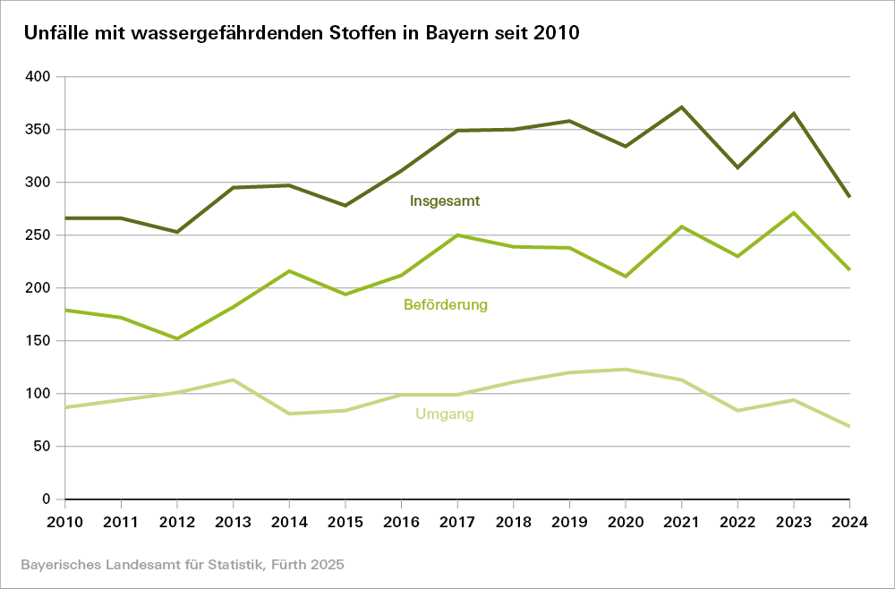 Fürth. Wie das Bayerische Landesamt für Statistik mitteilt, werden im Jahr 2024 in Bayern insgesamt 286 meldepflichtige Unfälle mit wassergefährdenden Stoffen registriert, 43 davon in Wasserschutzgebieten bzw. Heilquellenschutz-, Überschwemmungs- oder sonstigen schutzwürdigen Gebieten. Insgesamt werden – so weit von den zuständigen Überwachungsbehörden quantifizierbar – gut 623 Kubikmeter potenziell wassergefährdende Substanzen, darunter rund 109 Kubikmeter Mineralöle bzw. Mineralölprodukte, freigesetzt. Die durchschnittlich freigesetzte Menge bei allen Unfällen mit Mineralölprodukten liegt bei gut 446 Liter pro Unfall.