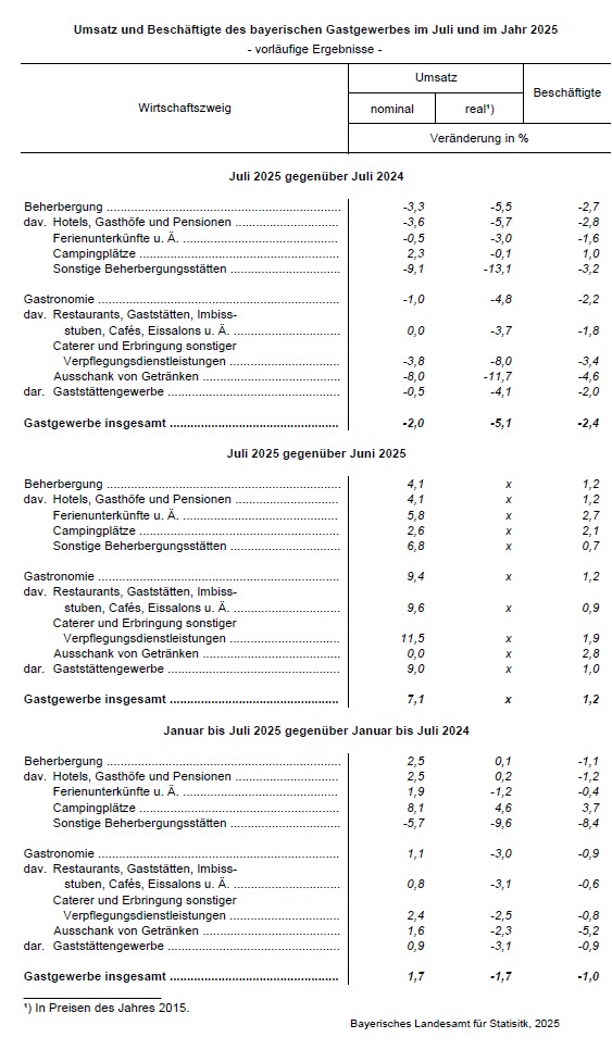 Sinkende Umsatz- und Beschäftigtenzahlen kennzeichnen die Konjunktur im bayerischen Gastgewerbe im Juli 2025: Laut einer Mitteilung des Bayerischen Landesamts für Statistik nach vorläufigen Ergebnissen der „Monatsstatistik im Gastgewerbe“ geht der nominale Umsatz im bayerischen Gastgewerbe im Juli 2025 gegenüber dem Juli 2024 um 2,0 Prozent zurück, der reale Umsatz um 5,1 Prozent. Die Zahl der Beschäftigten nimmt um 2,4 Prozent ab.