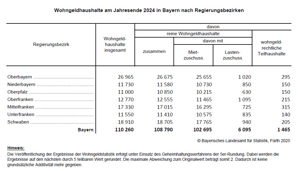 Schweinfurt. Zum Jahresende 2024 gibt es in Bayern 108 790 reine Wohngeldhaushalte, bei denen alle zum jeweiligen Haushalt zählenden Personen wohngeldberechtigt sind. Im Vergleich zum Jahresende 2023 (101 115 Haushalte) entspricht das einem Anstieg um 7,6 Prozent.