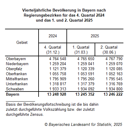 Bayerns Bevölkerung am 30.06.2025 bei rund 13,25 Millionen