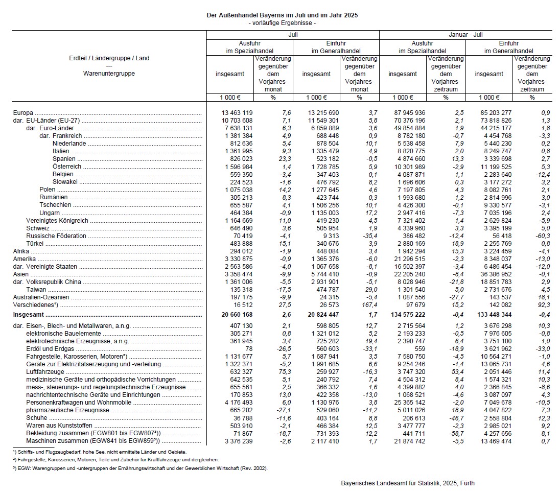 Nach vorläufigen Ergebnissen des Bayerischen Landesamts für Statistik zur Außenhandelsstatistik erzielt die bayerische Wirtschaft im Juli 2025 Ausfuhren im Wert von 20,7 Milliarden Euro, dies sind 2,6 Prozent mehr als im Juli 2024. Die Einfuhren nehmen zeitgleich um 1,7 Prozent auf 20,8 Milliarden Euro zu. Von Januar bis Juli 2025 sinken die Ausfuhren gegenüber dem Vorjahreszeitraum um 0,4 Prozent auf 134,6 Milliarden Euro, die Einfuhren gehen um 0,4 Prozent auf 133,4 Milliarden Euro zurück.