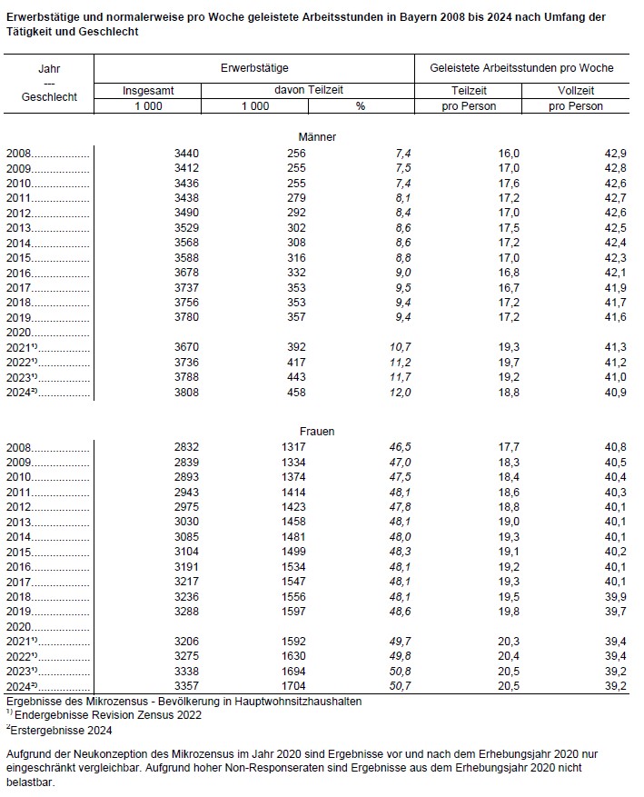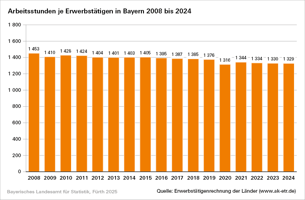 Seit 2008 ist die Zahl der bayerischen Erwerbstätigen von 6,7 Millionen auf 7,9 Millionen im Jahr 2024 gestiegen. Zugleich sinkt jedoch in den letzten Jahren die durchschnittliche Anzahl der Arbeitsstunden je Erwerbstätigen auf zuletzt 1 329 Stunden im Jahr 2024 oder durchschnittlich 25,6 Stunden pro Woche. Das sind 0,1 Prozent weniger als im Vorjahr. Damit ist die Jahresarbeitszeit pro Person weiterhin rückläufig. Grund hierfür ist vor allem die zunehmende Bedeutung von Teilzeitarbeit.