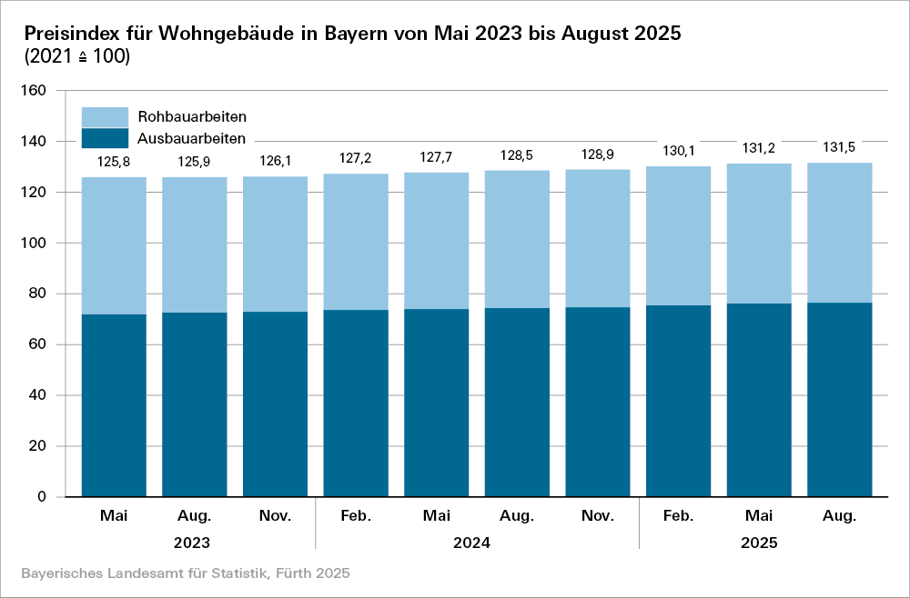 Wie die Expertinnen und Experten für die Bauleistungspreise im Bayerischen Landesamt für Statistik mitteilen, steigt der Preisindex für den Neubau von Wohngebäuden im August 2025 im Vergleich zum Vorjahresmonat um