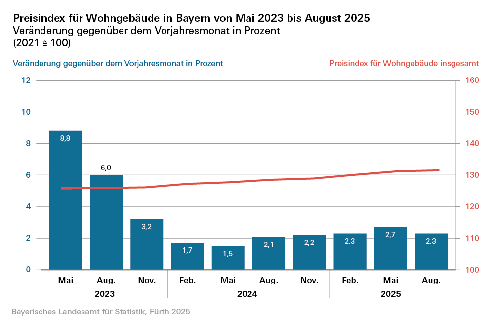 Im Jahresvergleich sind im August 2025 die Preise für den Neubau von Wohngebäuden in Bayern um durchschnittlich 2,3 Prozent gestiegen. Im Mai 2025 hatte die Preissteigerungsrate binnen Jahresfrist 2,7 Prozent betragen. Nach der sehr dynamischen Preisentwicklung, die seit Mitte 2022 mit Preissprüngen von über 17 Prozent zu beobachten war, stabilisierten sich die Preise seit 2024 auf vergleichsweise hohem Niveau.