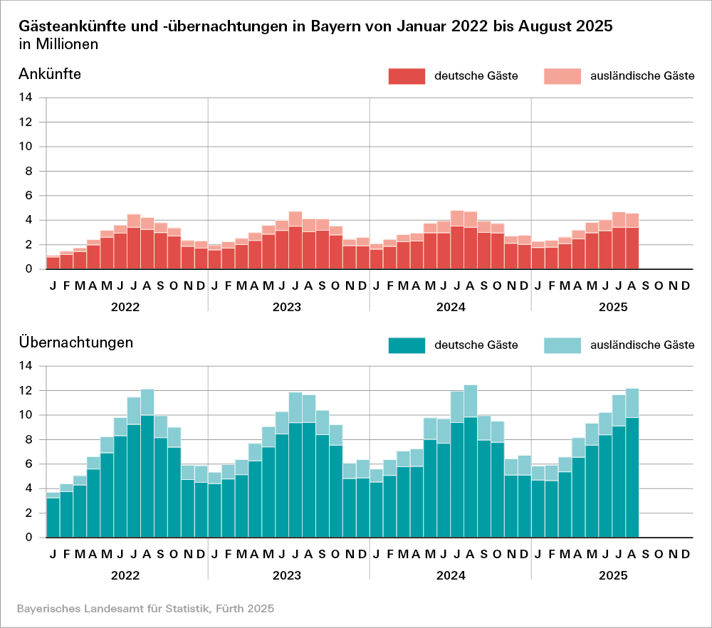 Die Übernachtungsrekorde aus dem August 2024 können im Jahr 2025 nicht erreicht werden. Knapp 1,2 Millionen internationale Reisende sind in Bayern zu Gast und übernachten gut