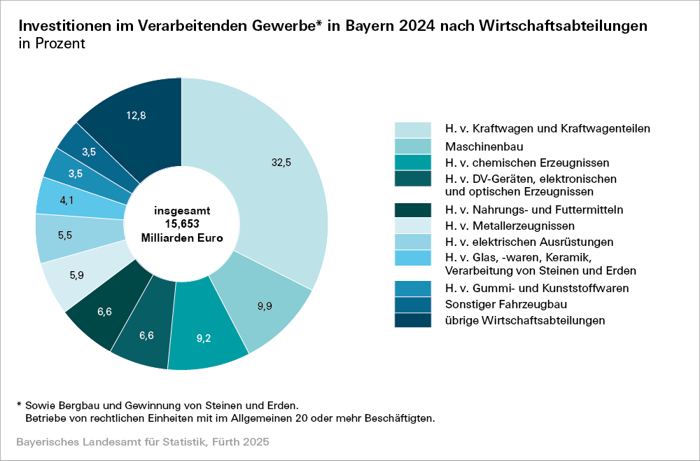 15,7 Milliarden Euro. Nach Angaben des Bayerischen Landesamts für Statistik sind das rund 46,7 Millionen Euro bzw. 0,3 Prozent weniger als im Vorjahr. Mit 13,3 Milliarden Euro werden 84,7 Prozent des gesamten Investitionsvolumens in Ausrüstungsgüter angelegt. Mit einem Anteil von 32,5 Prozent an den Gesamtinvestitionen ist die Kraftfahrzeugbranche der investitionsstärkste Wirtschaftssektor.