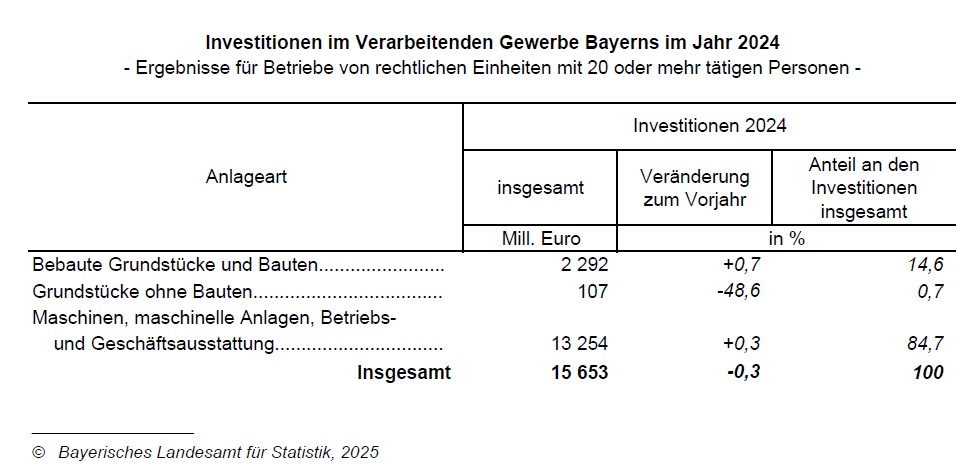 Fürth. Das Verarbeitende Gewerbe in Bayern (einschließlich Bergbau und Gewinnung von Steinen und Erden) verzeichnet im Jahr 2024 einen geringfügigen Rückgang des Investitionsvolumens auf 15,7 Milliarden Euro. Die Abnahme der Investitionstätigkeit zum Jahr 2023 beläuft sich auf 0,3 Prozent bzw. gut 46,7 Millionen Euro.