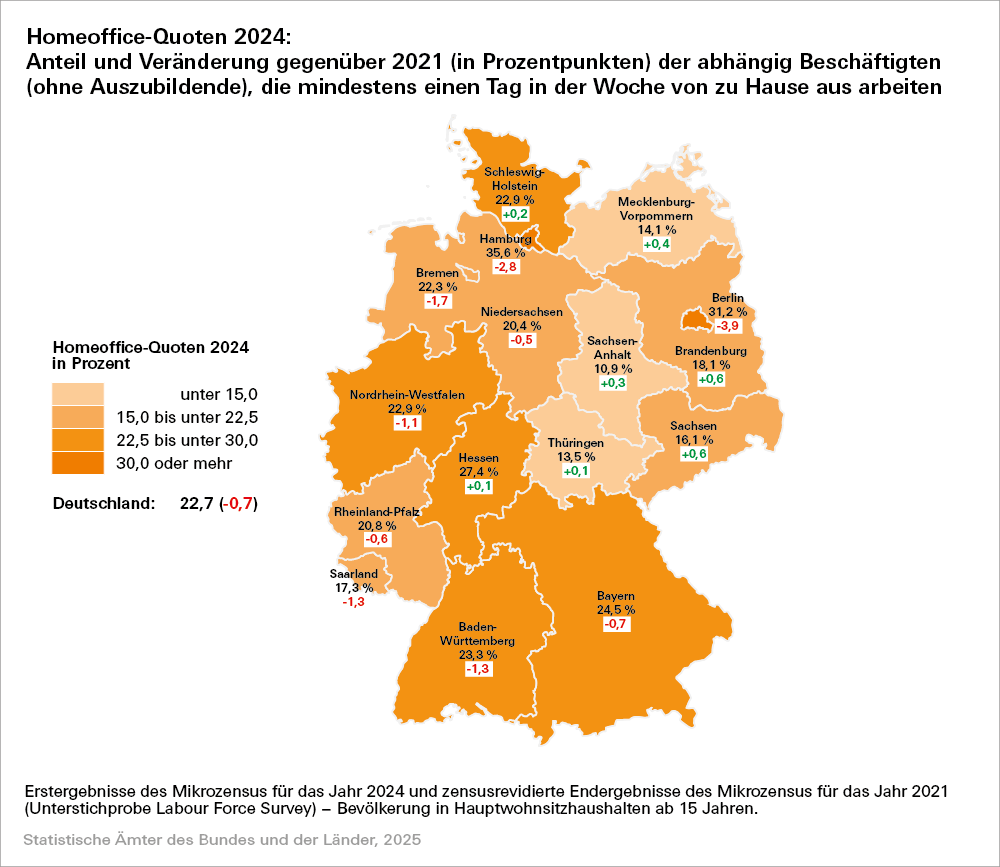 Fürth. Wie der Mikrozensus zeigt, arbeiten im Jahr 2024 in Bayern 24,5 Prozent der abhängig Beschäftigten mindestens einen Tag in der Woche von zu Hause aus. Damit liegt Bayern über dem Bundesdurchschnitt von 22,7 Prozent. Im bundesweiten Vergleich verzeichnen die Stadtstaaten Hamburg mit 35,6 Prozent und Berlin mit 31,2 Prozent die höchsten Homeoffice-Quoten. Hessen hat mit einer Quote von 27,4 Prozent eine höhere Quote als Bayern (24,5 Prozent) und Baden-Württemberg (23,3 Prozent).