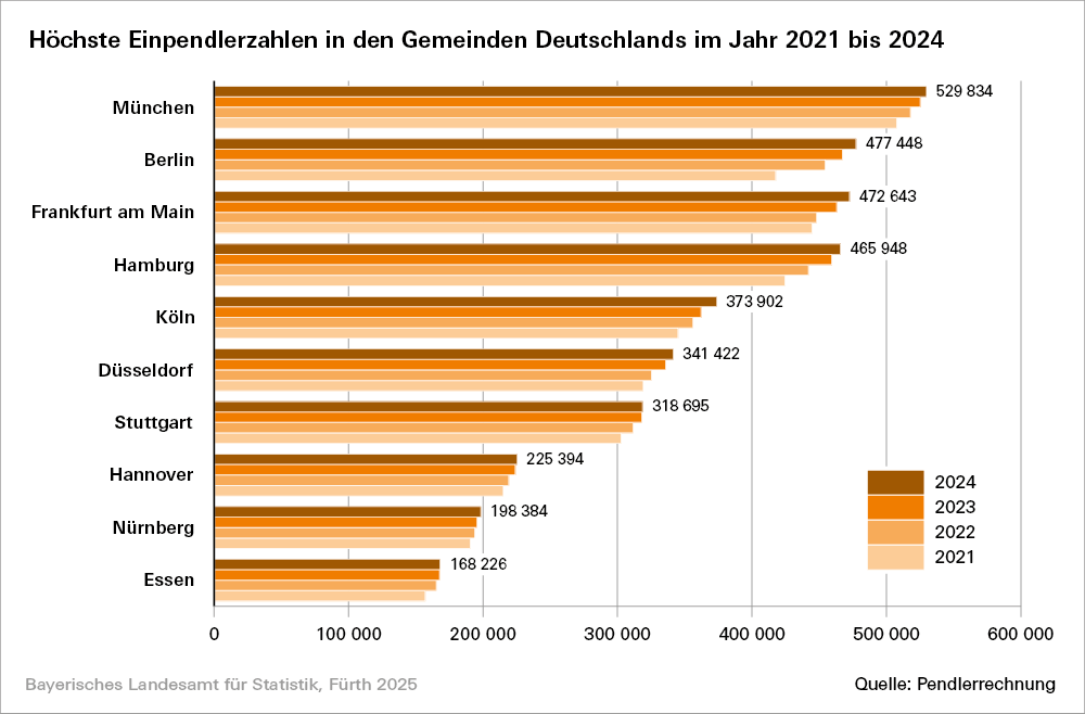 München bleibt auch im Jahr 2024 mit 529 834 Einpendlern an der Spitze der größten Einpendlerstädte vor Berlin (477 448) und Frankfurt am Main (472 643) und ist damit erneut die deutsche Pendlerhauptstadt. Allerdings gewinnt München mit einem Plus von 22 060 seit 2021 deutlich weniger Einpendler hinzu als Berlin (+ 59 669), Hamburg (+ 41 333) oder Köln