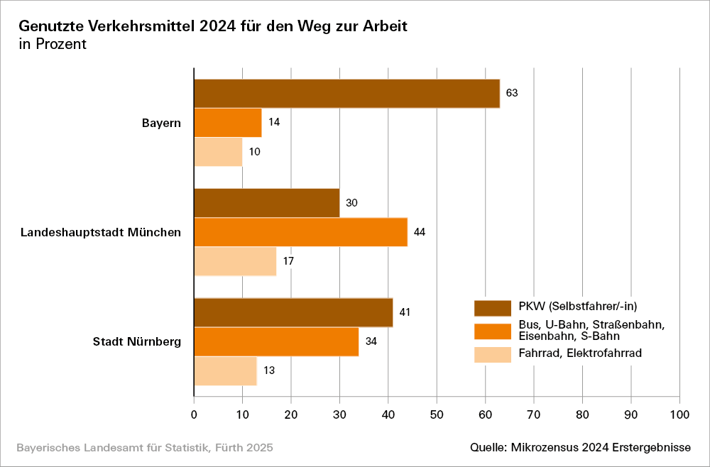 Ein differenzierter Blick in die Regionen Bayerns zeigt, dass in der Oberpfalz, Oberfranken und Niederbayern mit über 70 Prozent die meisten Pendler den eigenen PKW nutzen. Am seltensten wird in den Städten München (30 Prozent) und Nürnberg (41 Prozent) der eigene PKW für den Weg zur Arbeitsstätte genutzt. Die Städte Erlangen, Fürth und Schwabach können nur gemeinsam ausgewertet werden. Hier fahren rund 48 Prozent der Pendler mit dem Auto zur Arbeit. Auch in der Stadt Augsburg (49 Prozent) nutzen vergleichsweise wenig Berufspendler das Auto.