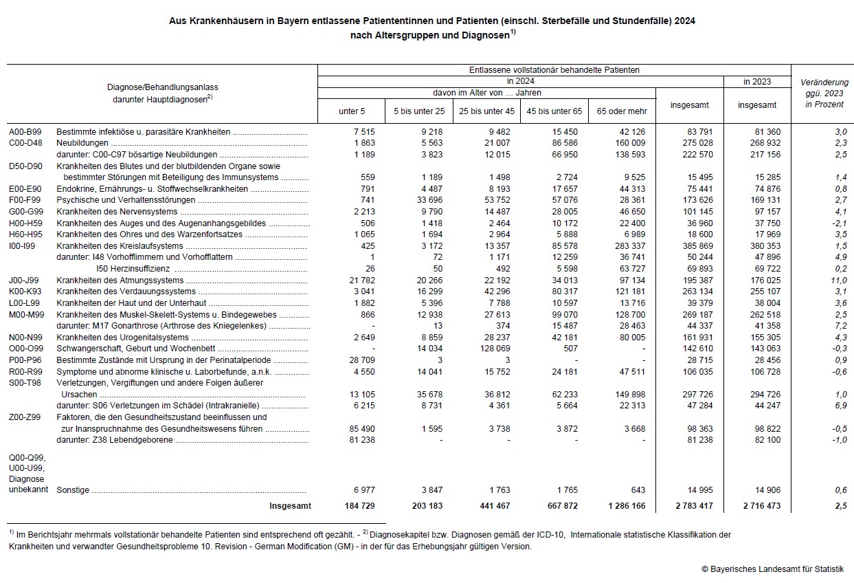 Nach Angaben des Bayerischen Landesamts für Statistik wurden im Jahr 2024 insgesamt 2,78 Millionen Patientinnen und Patienten (Fälle) aus der vollstationären Behandlung in bayerischen Krankenhäusern entlassen. Laut jährlich durchgeführter Krankenhausdiagnosestatistik sind dies 66 944 Behandlungsfälle bzw. 2,5 Prozent mehr als im Vorjahr.