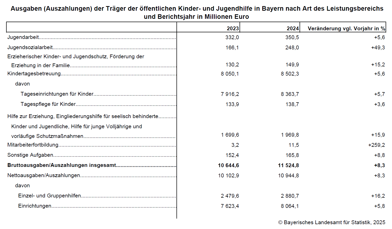 Nach Angaben des Bayerischen Landesamts für Statistik werden 2024 in Bayern rund 11 525 Millionen Euro für Leistungen und Aufgaben der Kinder- und Jugendhilfe verausgabt. Das entspricht 8,3 Prozent mehr als in 2023. Nach Abzug der Einnahmen liegen die Nettoausgaben bei 10 945 Millionen Euro. Mit 8 502 Millionen Euro stellt die Kindertagesbetreuung den größten Ausgabenposten dar. Hiervon entfallen 8 364 Millionen Euro auf Kindertageseinrichtungen und rund 139 Millionen Euro auf die Kindertagespflege.