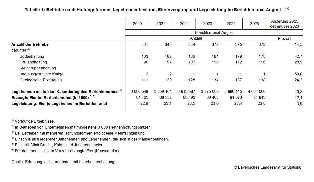 Der Bestand an Legehennen und die Zahl der erzeugten Eier steigen innerhalb des Zeitraums 2020 bis 2025 um 10,8 Prozent bzw. 12,4 Prozent. Somit kann die Bevölkerung Bayerns im Jahr 2025 rein rechnerisch mit mehr Eiern versorgt werden als fünf Jahre zuvor: Pro Kopf entfallen im August 2025 rund 7,2 Eier aus heimischer Produktion und damit mehr als im August 2020 (6,4 Eier) auf die bayerische Bevölkerung.