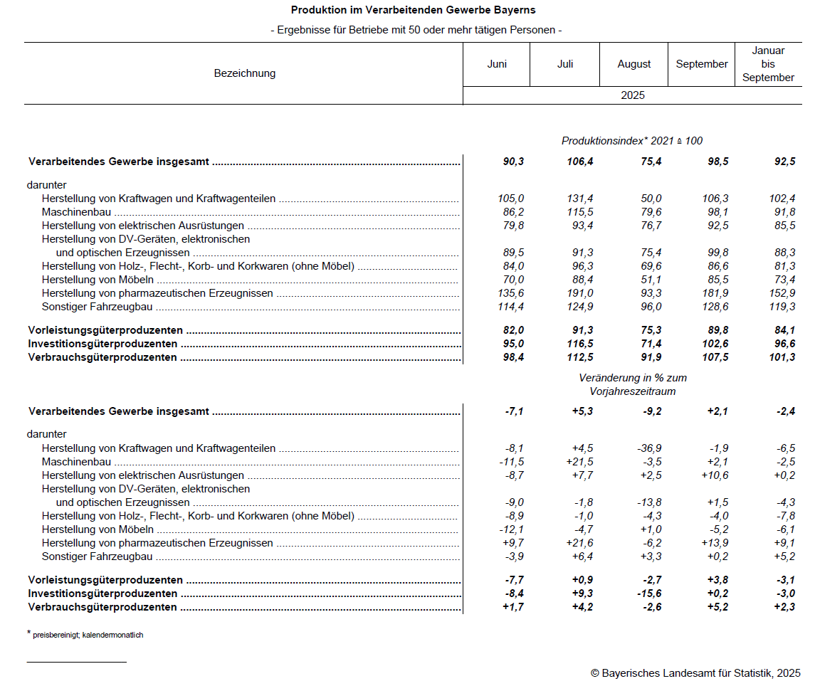 Nach Angaben des Bayerischen Landesamts für Statistik verzeichnet die Produktion des Verarbeitenden Gewerbes in Bayern im September 2025 ein Plus von 2,1 Prozent gegenüber dem Vorjahresmonat. Die ersten neun Monate des Jahres 2025 ergeben ein Minus von 2,4 Prozent.