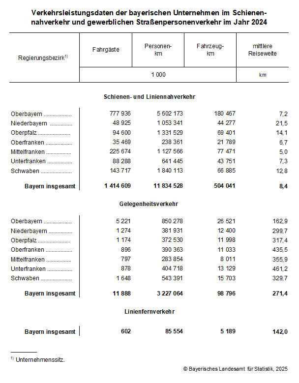 Ausführliche Ergebnisse enthält der Ende November 2025 erscheinende Statistische Bericht „Der Schienennahverkehr und der gewerbliche Straßenpersonenverkehr in Bayern 2024“. Der Bericht kann im Internet unter www.statistik.bayern.de/veroeffentlichungen als Datei kostenlos heruntergeladen werden. Weitere Informationen zum Bezug von Druckausgaben erhalten Sie beim Vertrieb per E-Mail (vertrieb@statistik.bayern.de), Telefon (0911 98208-6311) oder Fax (0911 98208-6638).