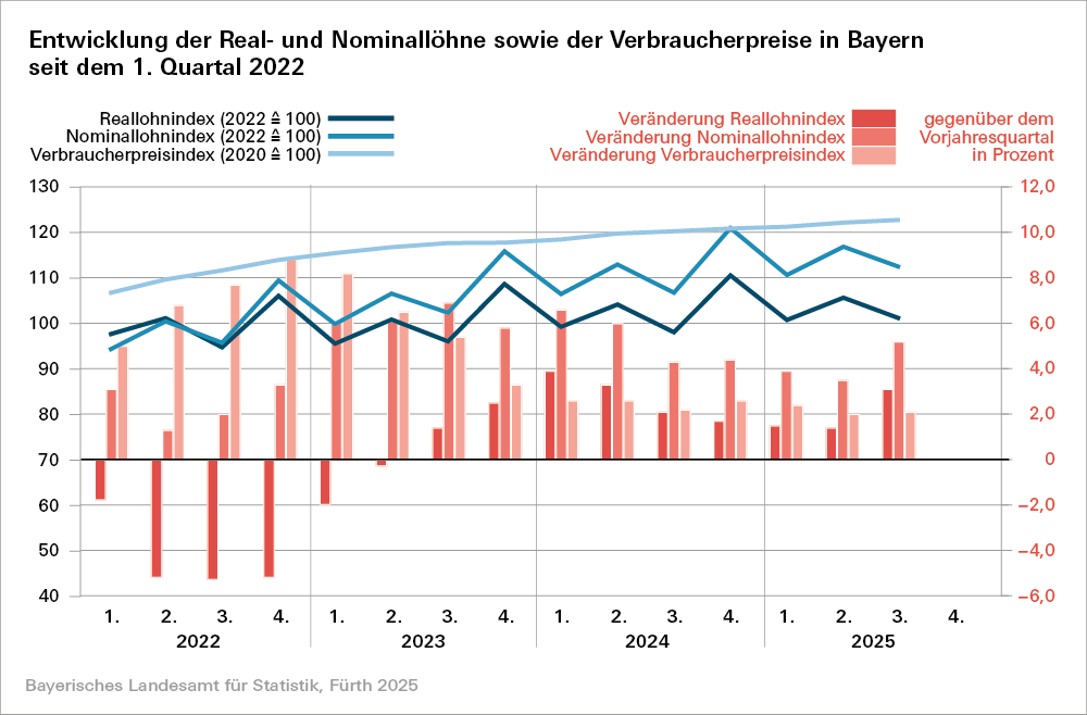 Fürth. Die nominalen Verdienste der Arbeitnehmerinnen und Arbeitnehmer in Bayern steigen im dritten Quartal 2025 um durchschnittlich 5,2 Prozent gegenüber dem Vorjahresquartal. Die Verbraucherpreise nehmen im dritten Quartal 2025 um 2,1 Prozent gegenüber dem Vorjahreszeitraum zu. Somit steigen die realen (preisbereinigten) Bruttomonatsverdienste einschließlich Sonderzahlungen aller Arbeitnehmerinnen und Arbeitnehmer im selben Zeitraum durchschnittlich um 3,1 Prozent. Damit fällt die Reallohnsteigerung höher aus als in den ersten beiden Quartalen des Jahres 2025.