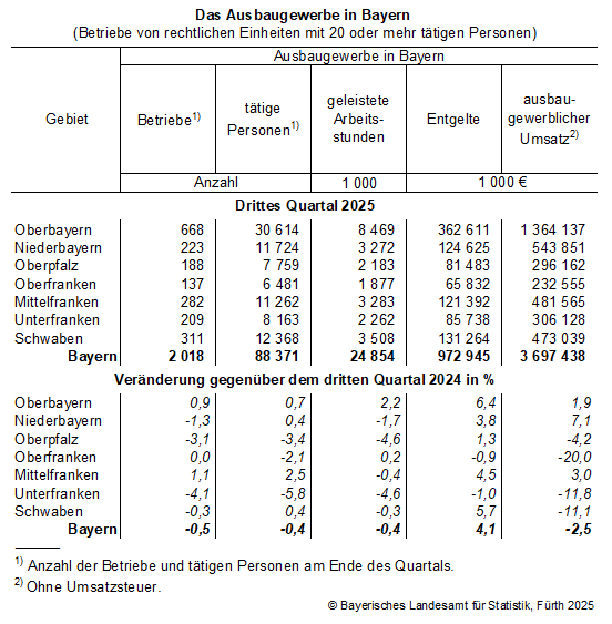 Im dritten Quartal 2025 zeigt sich ein verhaltenes Bild im bayerischen Ausbaugewerbe. Während die Zahl der einbezogenen Betriebe nahezu stabil bleibt, sinkt der ausbaugewerbliche Umsatz um 95,50 Millionen Euro bzw. 2,5 Prozent. Auffällig sind die deutlichen Umsatzrückgänge in mehreren Regierungsbezirken, die insgesamt nicht durch die realisierten Zuwächse in Oberbayern, Niederbayern und Mittelfranken ausgeglichen werden können.