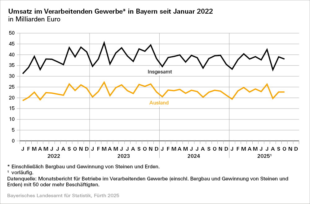 Umsätze der bayerischen Industrie im Oktober 2025 um 3,5 Prozent unter Vorjahresniveau