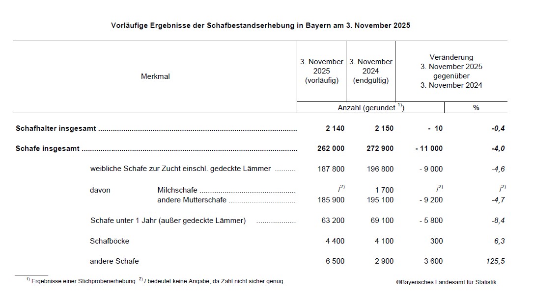 Fürth. Wie das Bayerische Landesamt für Statistik mitteilt, ist nach den vorläufigen Ergebnissen der Schafbestandserhebung zum Stichtag 3. November 2025 die Zahl der Schafe gegenüber dem Vorjahr um 4,0 Prozent auf 262 000 Tiere gesunken (-11 000 Tiere). Die Anzahl der schafhaltenden Betriebe in Bayern bleibt im Vergleich zum Vorjahr mit einem Minus von 0,4 Prozent stabil und liegt derzeit bei 2 140 Betrieben. Im Durchschnitt hält jeder Betrieb 122 Tiere, etwa fünf weniger als im Jahr 2024. Schafe werden zur Pflege der Kulturlandschaft und zur Erzeugung von Fleisch, Milch und Wolle eingesetzt.