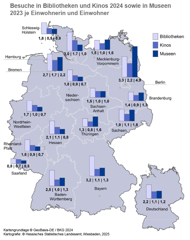 Bei den Besuchszahlen zeigen sich deutliche Unterschiede im Ländervergleich. Die höchsten Besuchszahlen weisen 2024 die Bibliotheken in Berlin (3,3 Besuche je Einwohner) und Bayern (3,2 Besuche je Einwohner) auf.