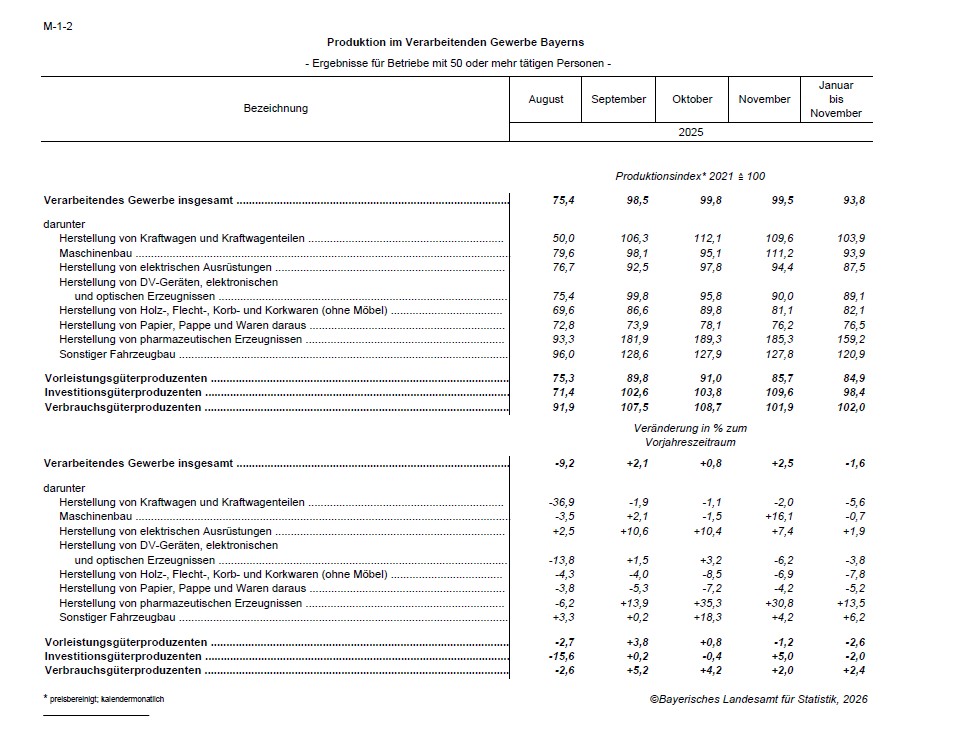 Nach Angaben des Bayerischen Landesamts für Statistik steigt die Produktion des Verarbeitenden Gewerbes in Bayern im November 2025 um 2,5 Prozent gegenüber dem Vorjahresmonat. Die ersten elf Monate des Jahres 2025 ergeben hingegen ein Minus von 1,6 Prozent.