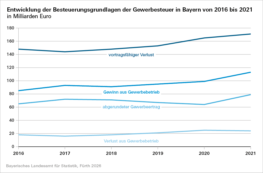 Hinsichtlich der Besteuerungsgrundlagen ist festzustellen, dass der Gewinn aus Gewerbebetrieb in 2021 bei 113,2 Milliarden Euro und somit um 14,8 Prozent über dem Vorjahreswert lag. Zieht man einen Vergleich innerhalb eines Fünf-Jahres-Zeitraumes, so erhöhte sich der Gewinn aus Gewerbebetrieb verglichen mit dem Jahr 2016 um 33,0 Prozent. Der Verlust aus Gewerbebetrieb 2021 betrug 24,2 Milliarden Euro.