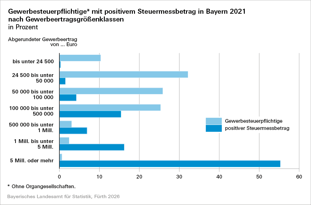 Schweinfurt. Nach Mitteilung des Bayerischen Landesamts für Statistik wurde im Jahr 2021 bayernweit ein Gewerbesteuermessbetrag von insgesamt 3,2 Milliarden Euro als Besteuerungsgrundlage für die Gewerbesteuer festgesetzt. Das bedeutet einen Anstieg um 15,7 Prozent im Vergleich zu 2020. Insgesamt wurden 775 151 gewerbesteuerpflichtige Betriebe (ohne Organgesellschaften) in die Berechnung einbezogen; 2,2 Prozent mehr als im Vorjahr. Verglichen mit 2016 erhöhte sich die Anzahl der gewerbesteuerpflichtigen Betriebe 2021 sogar um 12,8 Prozent.