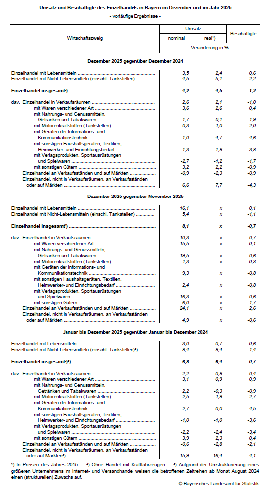 „Umsatz und Beschäftigte im bayerischen Einzelhandel im Dezember 2025“ (Bestellnummer: G1100C).