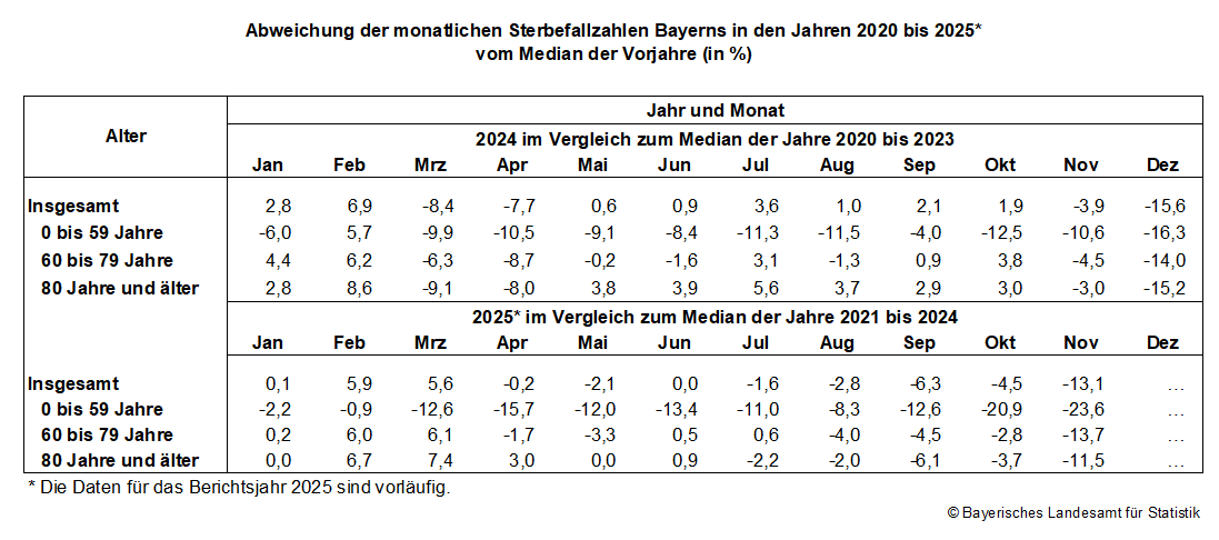Fürth. Wie das Expertenteam des Bayerischen Landesamts für Statistik nach Auswertung vorläufiger Daten mitteilt, ist die Zahl der Verstorbenen im Freistaat im November 2025 mit 11 096 Personen insgesamt niedriger als der Median der Jahre 2021 bis 2024 (12 766 Verstorbene). Dabei ist zu beachten, dass in die Berechnung des Medians der Jahre 2021 bis 2024 teilweise Jahre mit pandemiebedingt hohen Sterbefallzahlen einfließen, wodurch der Vergleichswert für das Jahr 2025 relativ hoch ist.