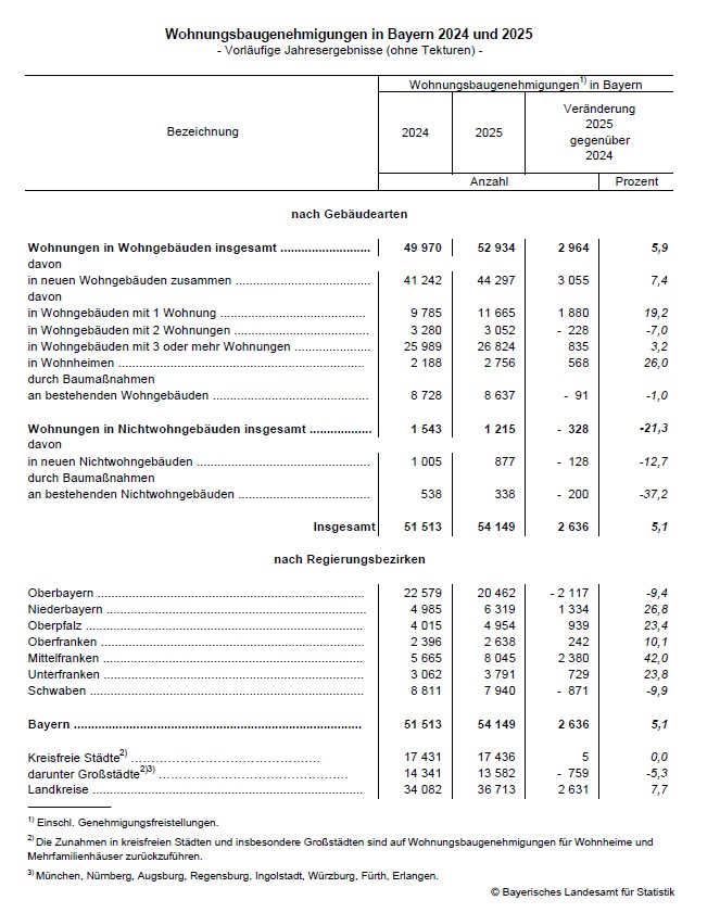 Schweinfurt. Nach vorläufigen Ergebnissen der amtlichen Baugenehmigungsstatistik werden in Bayern im Jahr 2025 insgesamt 54 149 Wohnungsbaugenehmigungen (einschließlich Genehmigungsfreistellungen) erteilt. Nach Auskunft der Fachgruppe im Bayerischen Landesamt für Statistik ist die Zahl der zum Bau freigegebenen Wohnungen um 2 636 beziehungsweise 5,1 Prozent gegenüber dem Vorjahreszeitraum angestiegen.