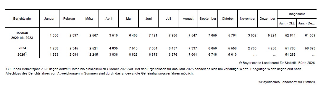 1) Für das Berichtsjahr 2025 liegen derzeit Daten bis einschließlich Oktober 2025 vor. Bei den Ergebnissen für das Jahr 2025 handelt es sich um vorläufige Werte. Endgültige Werte liegen erst nach Abschluss des Berichtsjahres vor. Abweichungen in Summen sind durch das angewandte Geheimhaltungsverfahren möglich.