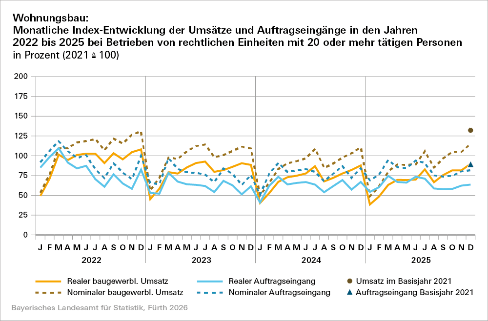 Im Vergleich zum Bezugsmonat des Basisjahres 2021 liegen die Auftragseingänge insgesamt im Dezember 2025 nominal um 7,5 Prozentpunkte höher, preisbereinigt jedoch um 17,6 Prozentpunkte niedriger (siehe Grafik 1). Auch beim Umsatz zeigt sich dieser Gegensatz: Während gegenüber 2021 nominal ein Anstieg von 11,4 Prozentpunkten erreicht wird, ergibt sich real ein Rückgang um 22,1 Prozentpunkte. Der (preisbereinigte) Werte des Bezugsmonats Dezember im Basisjahre 2021 wird in den Graphiken 1 und 2 jeweils als brauner Punkt (Umsatz) und blaues Dreieck (Auftragseingang) über den aktuellen Monatswerten dargestellt.