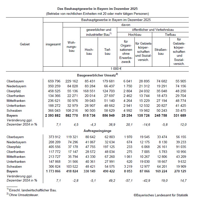 Die Auftragseingänge im bayerischen Bauhauptgewerbe steigen im Dezember 2025 ebenfalls um 7,1 Prozent. Deutlich positiv entwickeln sich die Auftragsvergaben im Vorjahresvergleich in allen Bausparten des Tiefbaus: +49,2 Prozent im gewerblichen und industriellen Tiefbau, +19,0 Prozent im Straßenbau und +14,7 Prozent in öffentlichen Tiefbau für Gebietskörperschaften und Sozialversicherungen.