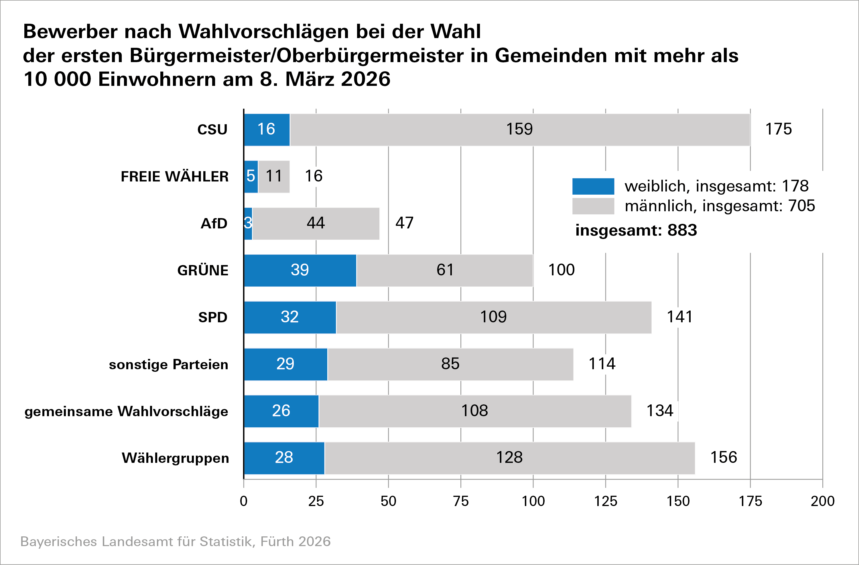 Fürth. Am 8. März 2026 finden die allgemeinen Gemeinde- und Landkreiswahlen im Freistaat statt. Das Bayerische Landesamt für Statistik wird am Wahlabend, Sonntag, 8. März 2026, die Ergebnisse der Schnellmeldungen aller Oberbürgermeisterwahlen und der Bürgermeisterwahlen in kreisangehörigen Gemeinden mit mehr als 10 000 Einwohnern sowie der Landratswahlen in der Webpräsentation veröffentlichen: www.kommunalwahl2026.bayern.de