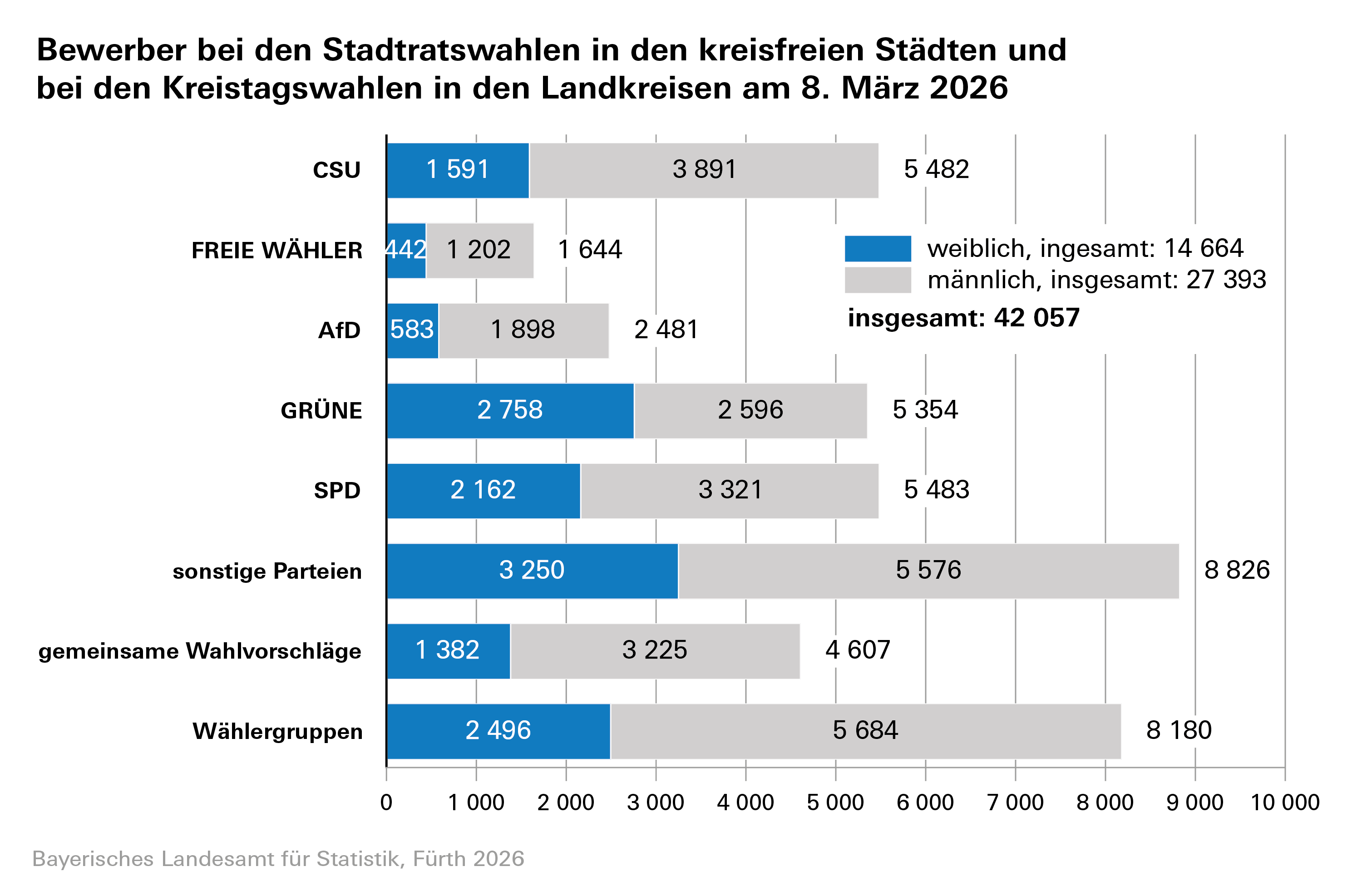 Zusammengenommen stellen sich somit auf Ebene der 96 Landkreise und kreisfreien Städte insgesamt 42 057 Bewerber zur Wahl. Das entspricht einem leichten Anstieg in Höhe von rund 2,0 Prozent gegenüber den Kommunalwahlen 2020. Die Zahl der Frauen unter den Bewerbern (insgesamt 14 664) stieg gegenüber 2020 geringfügig um rund 3,5 Prozent an, was einem Zuwachs des Frauenanteils um rund 1,5 Prozentpunkte entspricht.