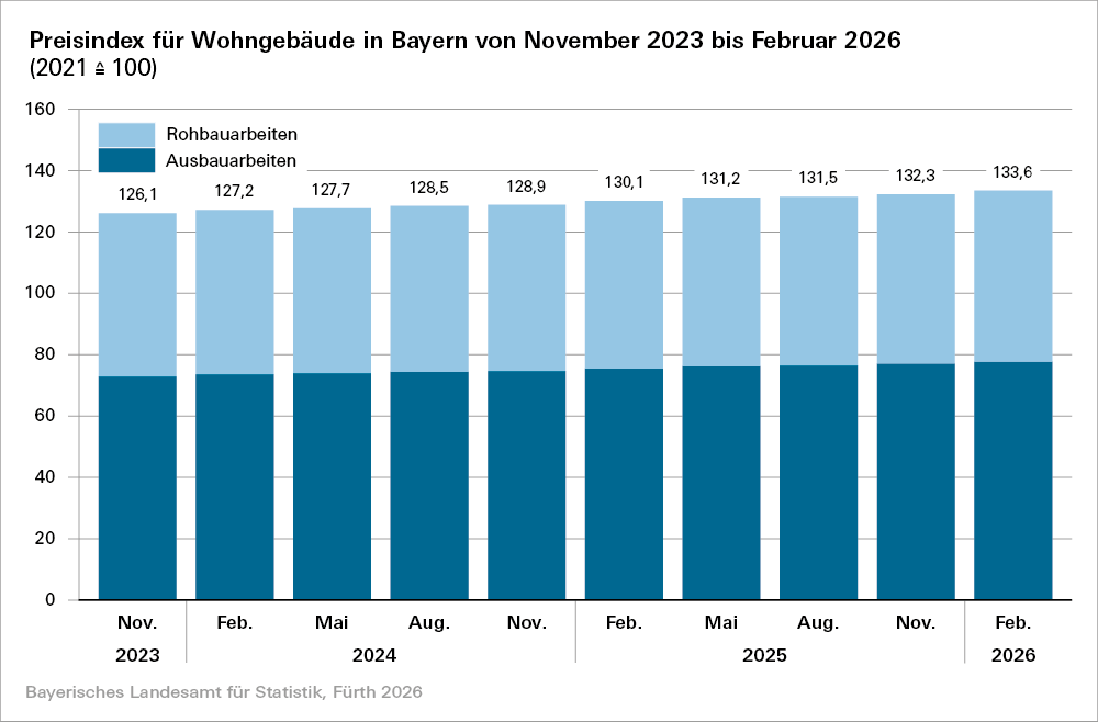 Im Jahresvergleich sind im Februar 2026 die Preise für den Neubau von Wohngebäuden in Bayern um durchschnittlich 2,7 Prozent gestiegen. Im November 2025 lag die Preissteigerungsrate binnen Jahresfrist auf einem ähnlichen Niveau (+2,6 Prozent). Seit 2021 sind die Preise für den Neubau für Wohnungen in Bayern damit um 33,6 Prozent gestiegen.