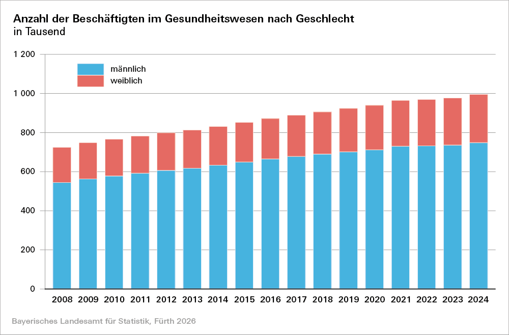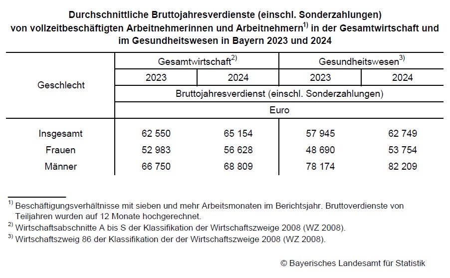 1,9 Prozent auf knapp 996 000. Der Anstieg fällt bei Männern mit 2,6 Prozent stärker aus als bei Frauen mit 1,7 Prozent. Zuwächse sind insbesondere bei den Beschäftigten in ambulanten und (teil-)stationären Einrichtungen zu verzeichnen, während es im Gesundheitsschutz zu Rückgängen kommt, die auf einen außergewöhnlich starken Personalanstieg während der COVID-19-Pandemie mit anschließend beschleunigtem Abbau zurückzuführen sind. Laut der Verdiensterhebung steigen die durchschnittlichen Bruttojahresverdienste der Vollzeitbeschäftigten im Gesundheitswesen in Bayern im Jahr 2024 mit 8,3 Prozent überdurchschnittlich stark – bei Frauen deutlicher als bei Männern
