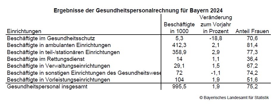 Fürth. Nach den Berechnungen der Arbeitsgruppe „Gesundheitsökonomische Gesamtrechnungen der Länder“ arbeiten im Jahr 2024 knapp 996 000 Beschäftigte im bayerischen Gesundheitswesen. Das ist ein Anstieg um 1,9 Prozent gegenüber dem Vorjahr. Rein rechnerisch kommen in Bayern