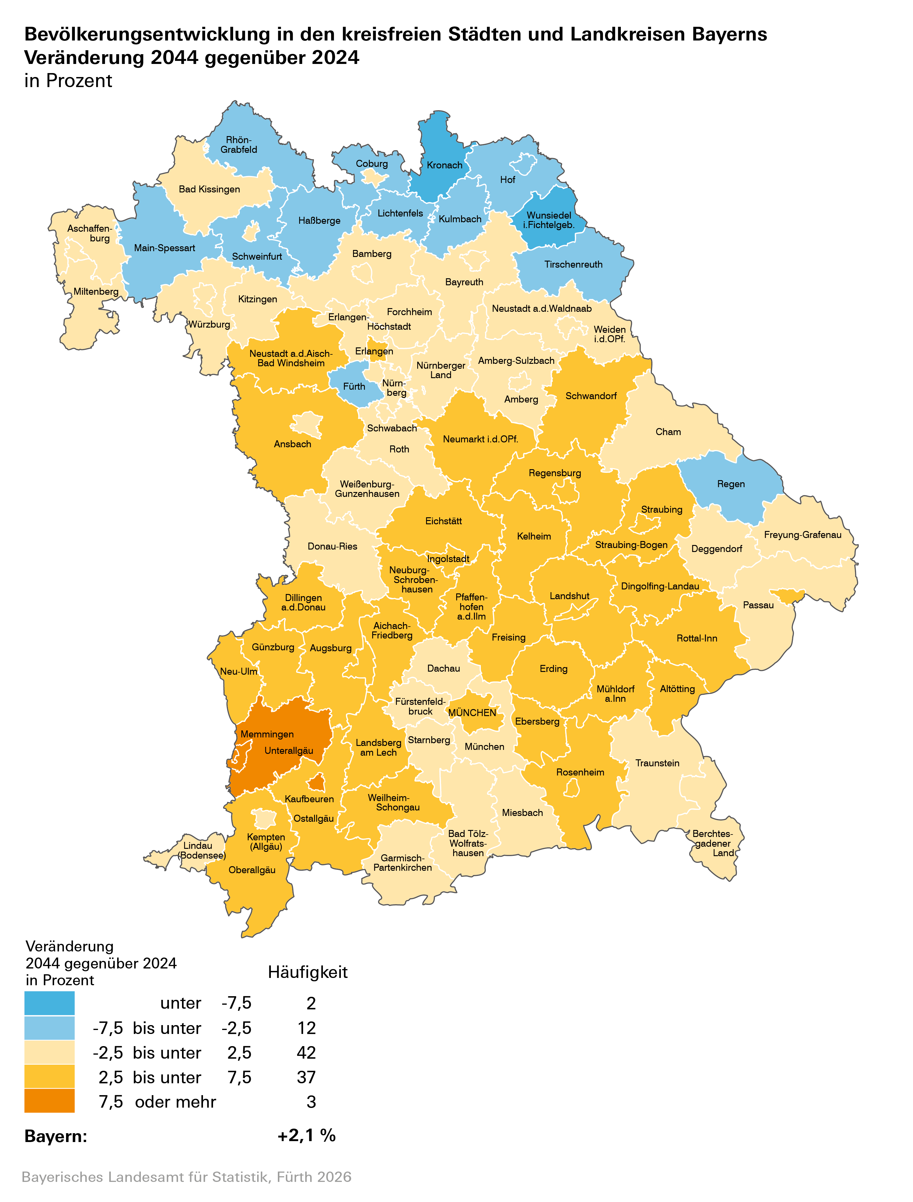 785 (38,2 Prozent) von einem deutlichen Bevölkerungswachstum ausgehen, 802 (39,0 Prozent) der bayerischen Gemeinden werden mit Veränderungen zwischen -2,5 Prozent bis unter +2,5 Prozent eine relativ stabile Bevölkerungsentwicklung aufweisen. Für 469 Gemeinden (22,8 Prozent) werden bis zum Jahr 2038 deutlichere Bevölkerungsrückgänge erwartet.