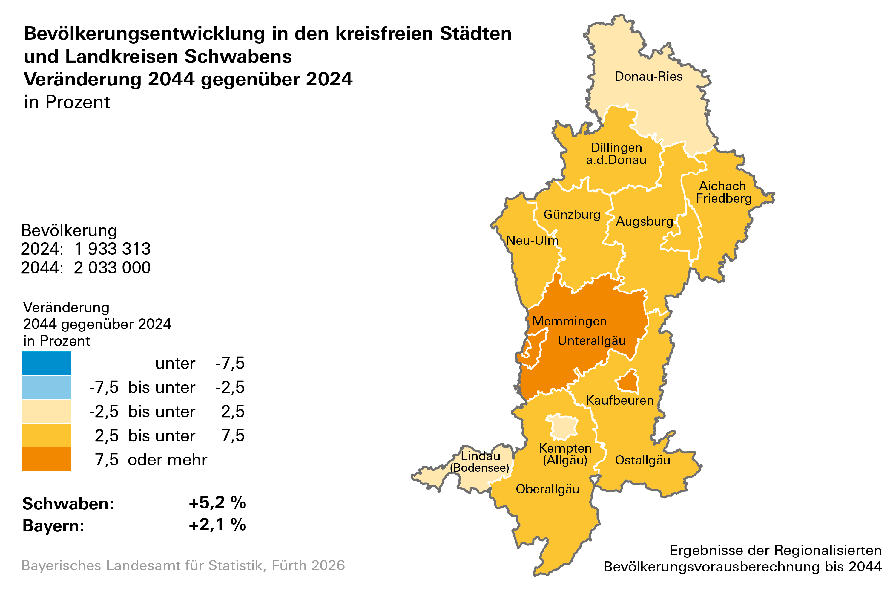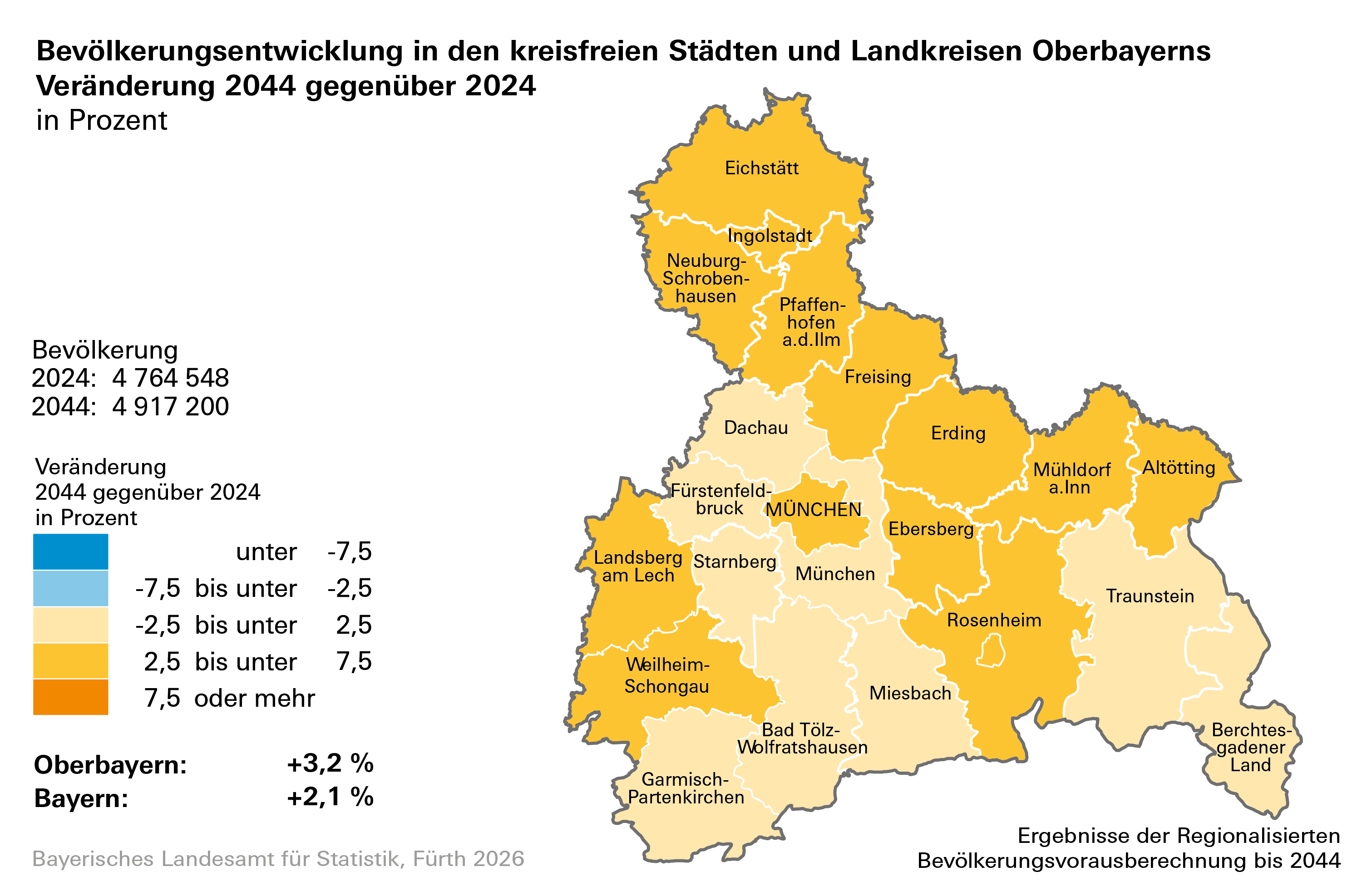 - Bevölkerung Bayerns wächst in der Vorausberechnung weiterhin moderat. Es ergibt sich ein Zuwachs von rund 278 000 Einwohnern bis zum Jahr 2044. Die Gesamteinwohnerzahl Bayerns läge dann bei etwa 13,53 Millionen.