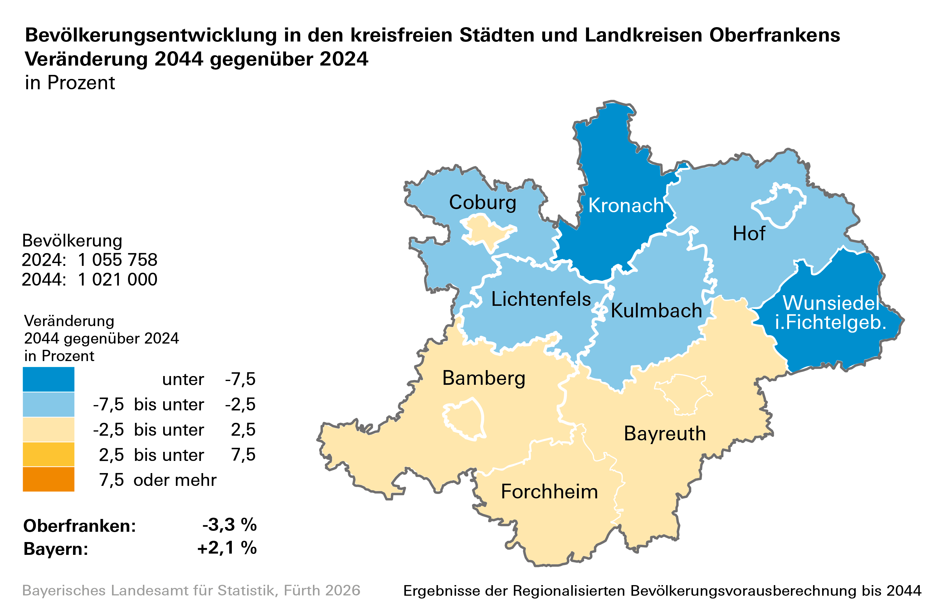 Fürth. Das Bayerische Landesamt für Statistik hat zwei neue Bevölkerungsvorausberechnungen veröffentlicht: Die jährlich aktualisierte Regionalisierte Bevölkerungsvorausberechnung bis zum Jahr 2044 für den Freistaat, die Regierungsbezirke sowie die kreisfreien Städte und Landkreise sowie den Demographie-Spiegel bis 2038/2044* für alle 2056 bayerischen Gemeinden.