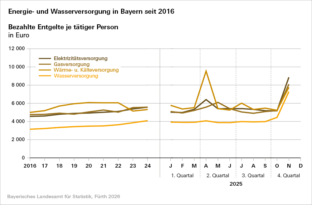 Die Konjunktur- und Strukturerhebungen liefern bei Betrieben von Unternehmen der Energie- und Wasserversorgung mit 20 oder mehr Beschäftigten Daten zu den dort tätigen Personen, deren geleisteten Arbeitsstunden und der dort bezahlten Entgelte.